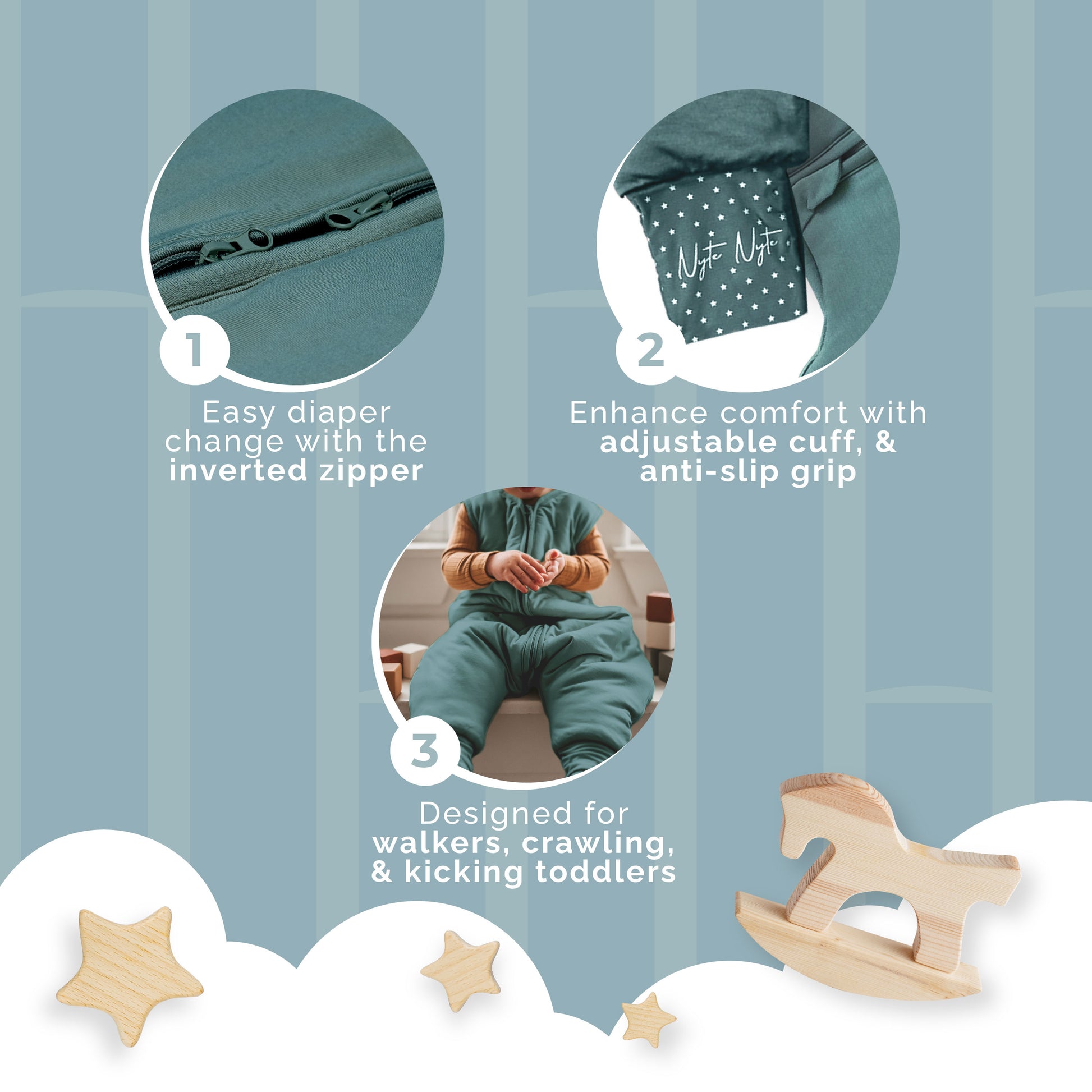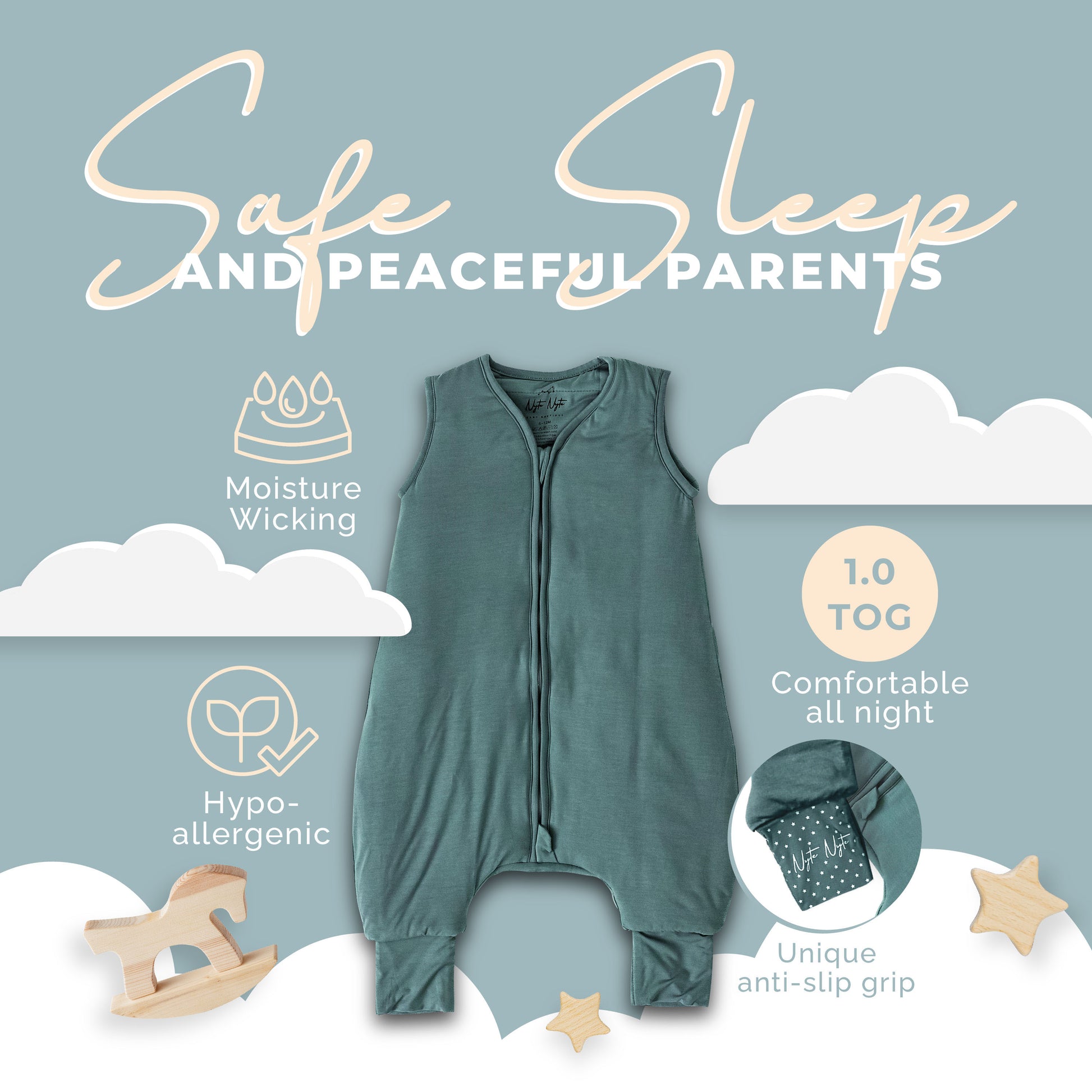 Our innovative separate leg design allows your baby to sleep comfortably and freely, while our adjustable cuffs let you cover or uncover baby's feet depending on the season or room temperature. Our foot cuffs also have anti-slip grip allowing your baby to wear the Nyte Nyte while crawling and walking around without slipping.