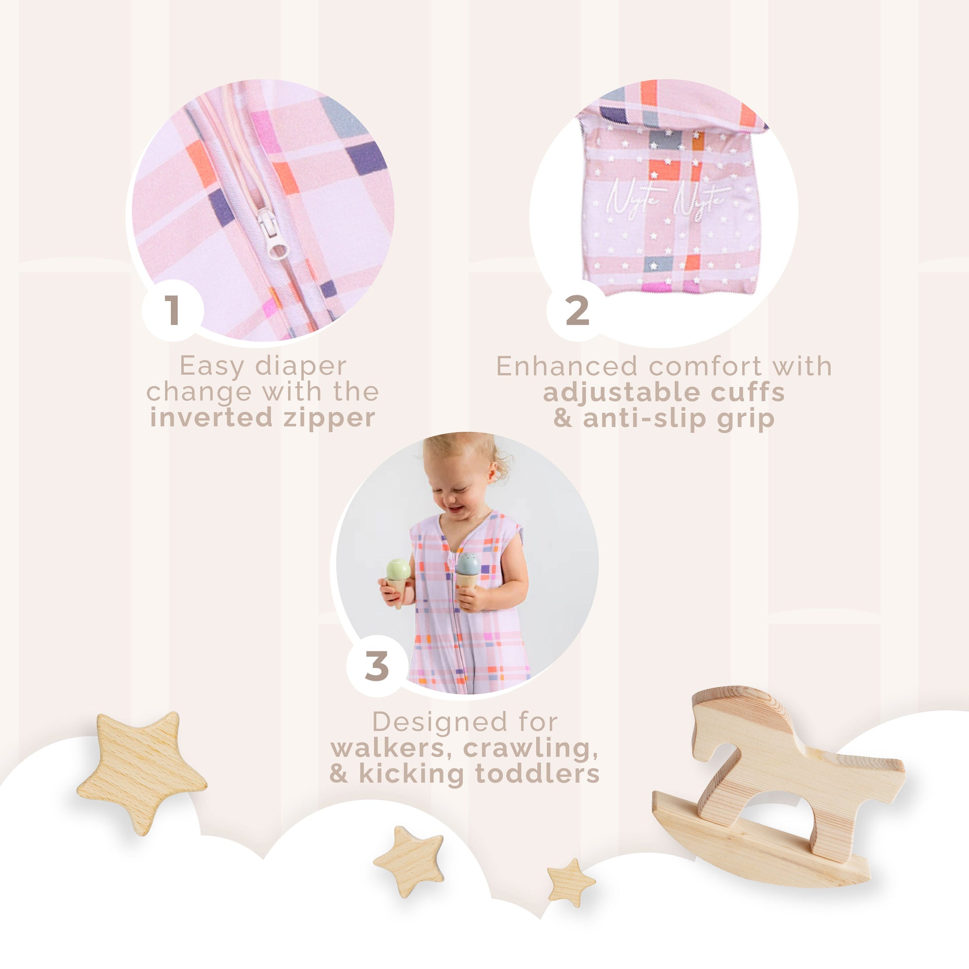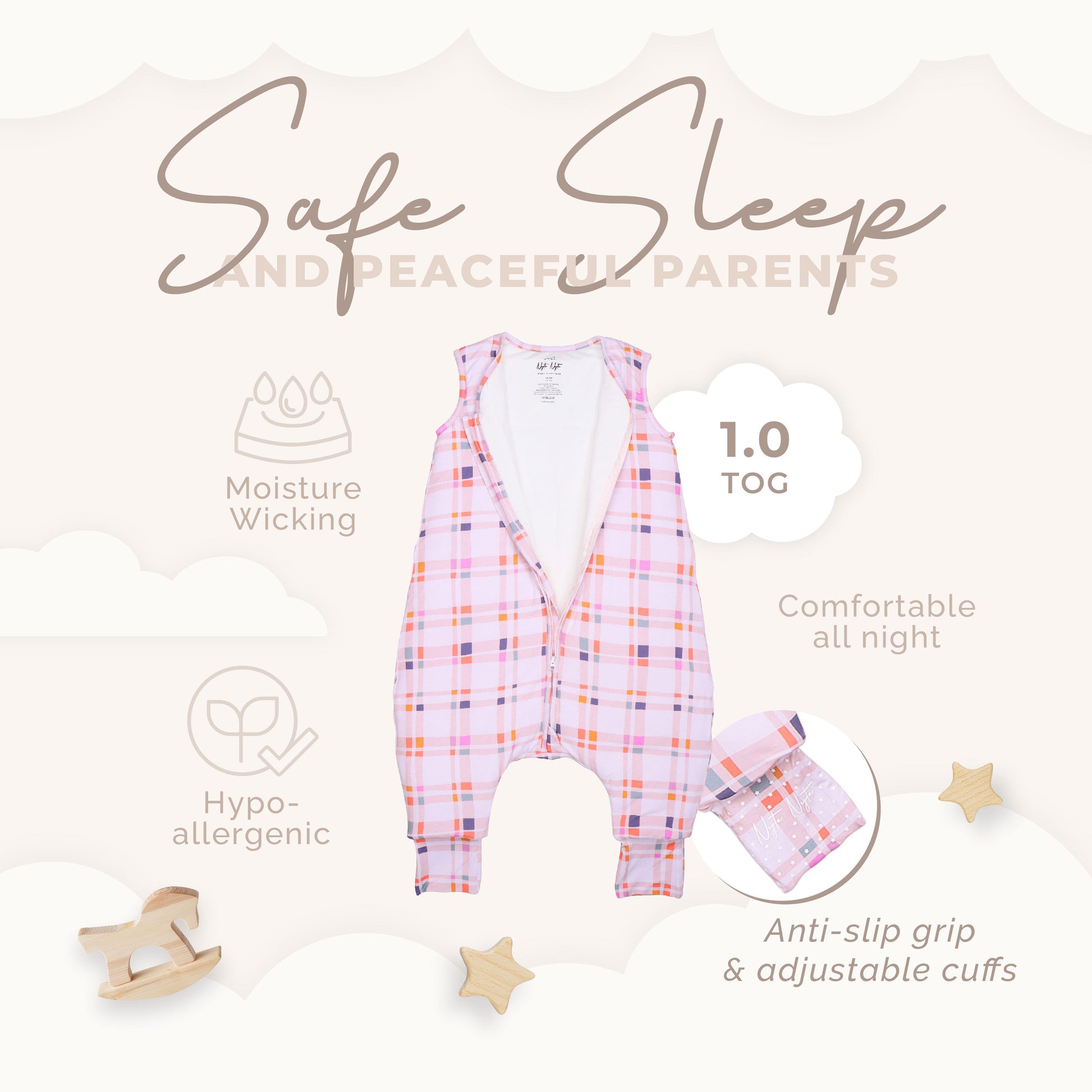 Our innovative separate leg design allows your baby to sleep comfortably and freely, while our adjustable cuffs let you cover or uncover baby's feet depending on the season or room temperature. Our foot cuffs also have anti-slip grip allowing your baby to wear the Nyte Nyte while crawling and walking around without slipping.