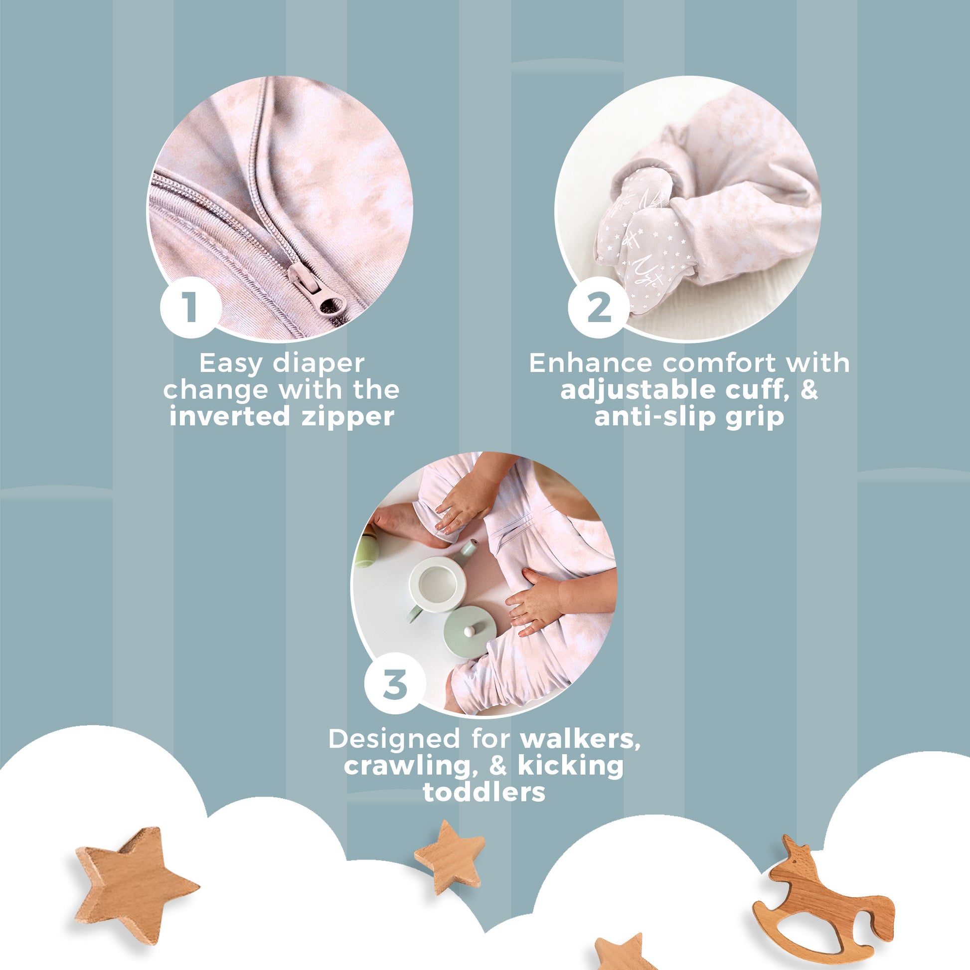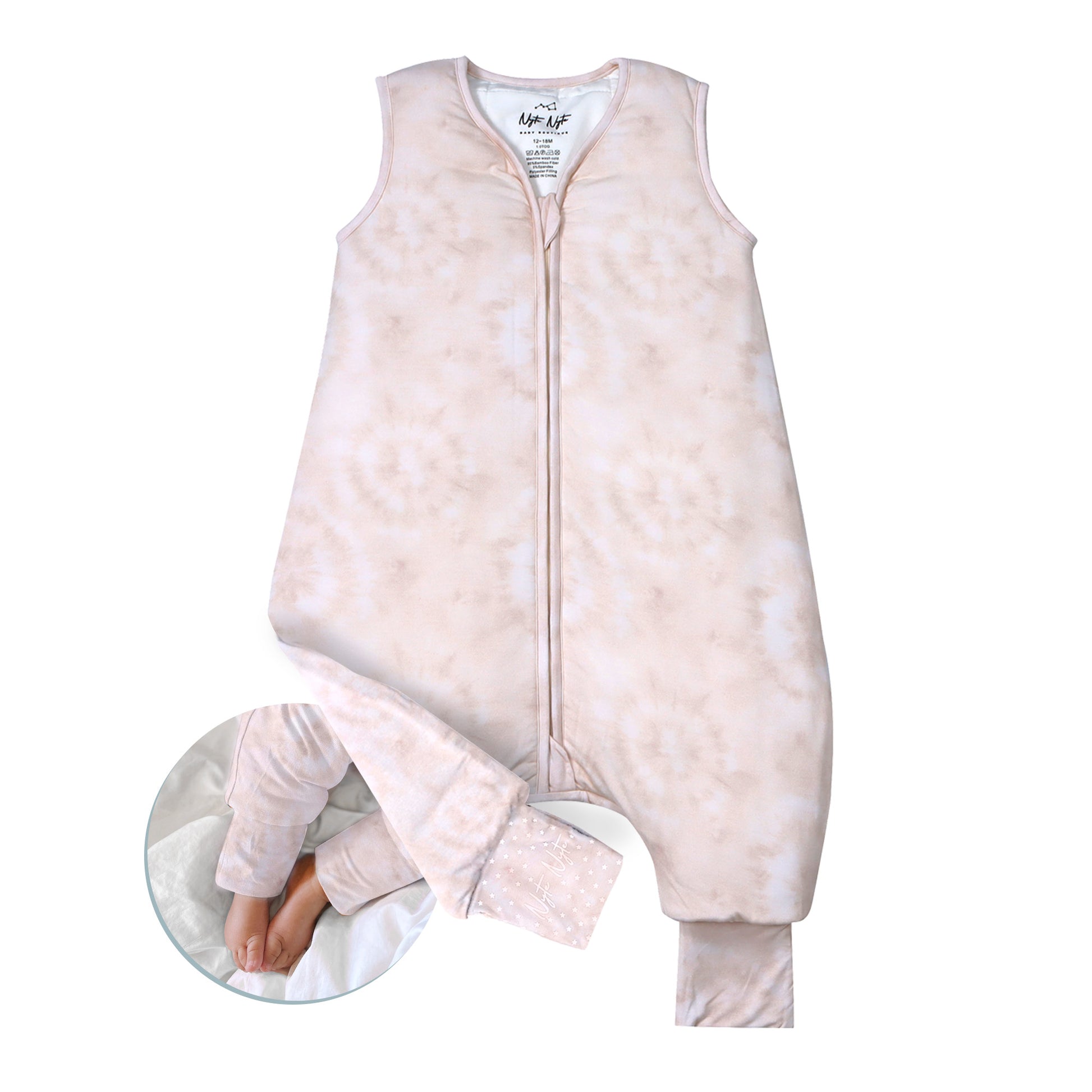 Our innovative separate leg design allows your baby to sleep comfortably and freely, while our adjustable cuffs let you cover or uncover baby's feet depending on the season or room temperature. Our foot cuffs also have anti-slip grip allowing your baby to wear the Nyte Nyte while crawling and walking around without slipping.