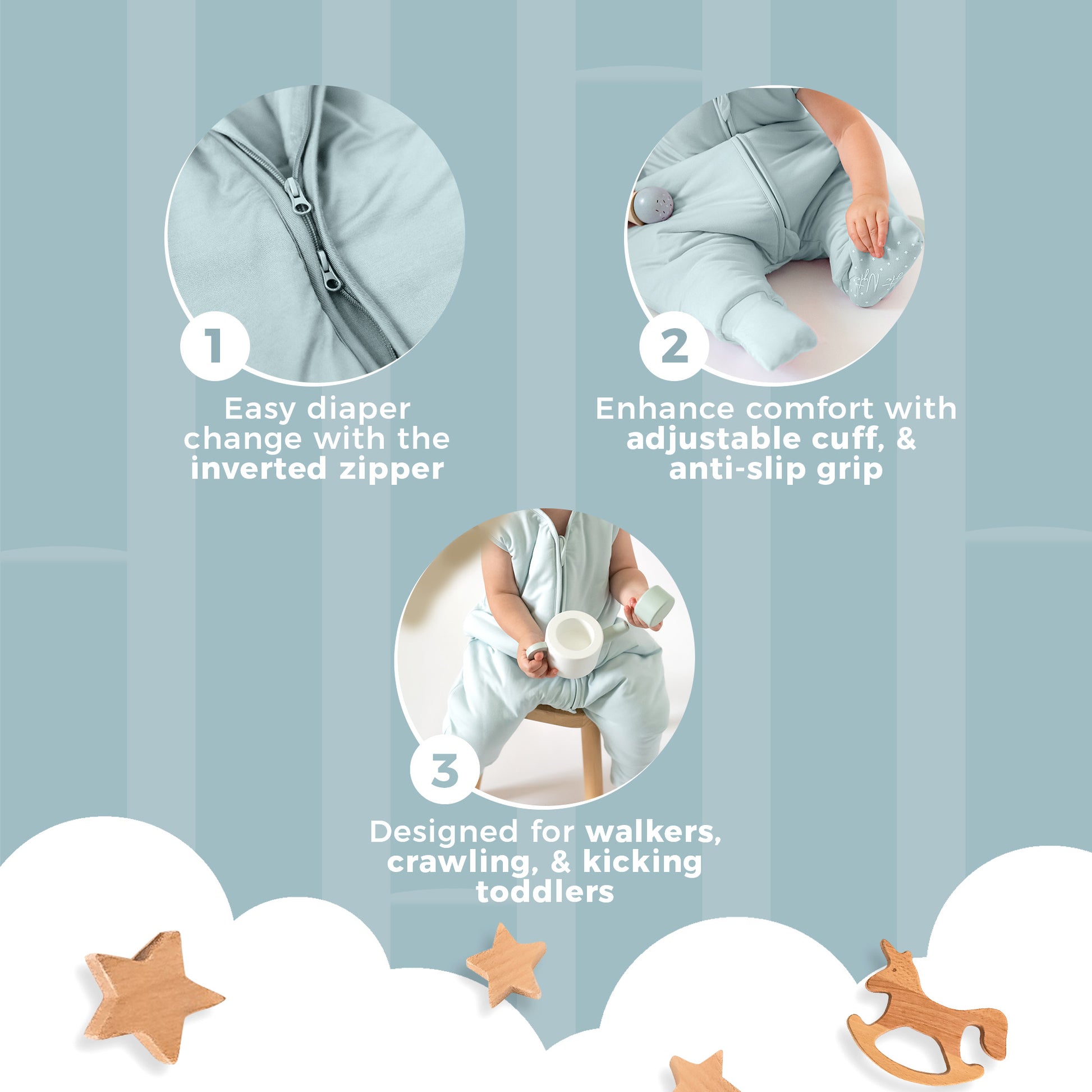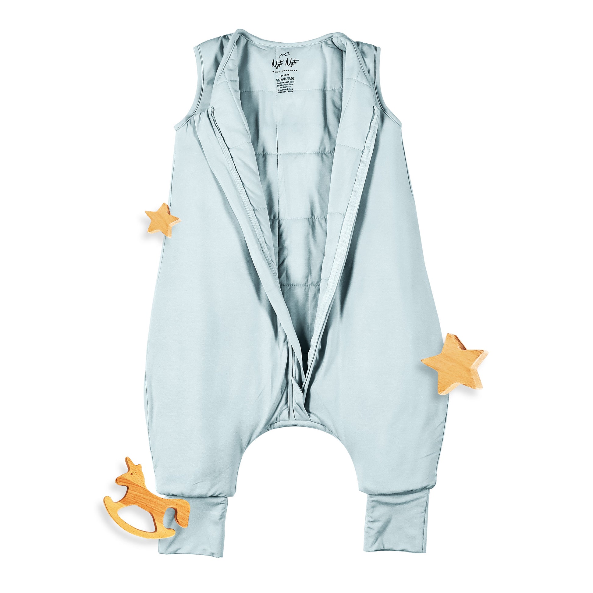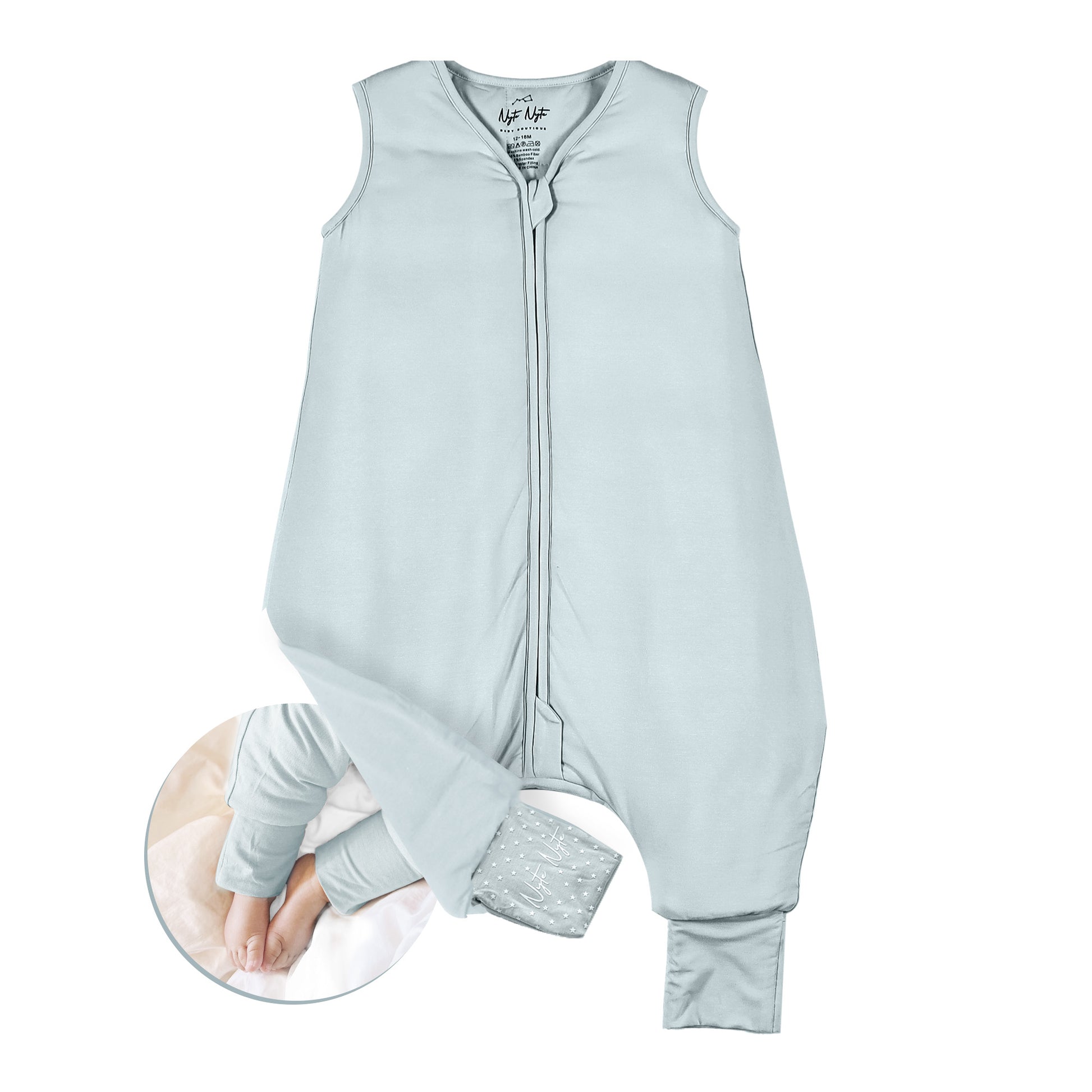 Our innovative separate leg design allows your baby to sleep comfortably and freely, while our adjustable cuffs let you cover or uncover baby's feet depending on the season or room temperature. Our foot cuffs also have anti-slip grip allowing your baby to wear the Nyte Nyte while crawling and walking around without slipping.