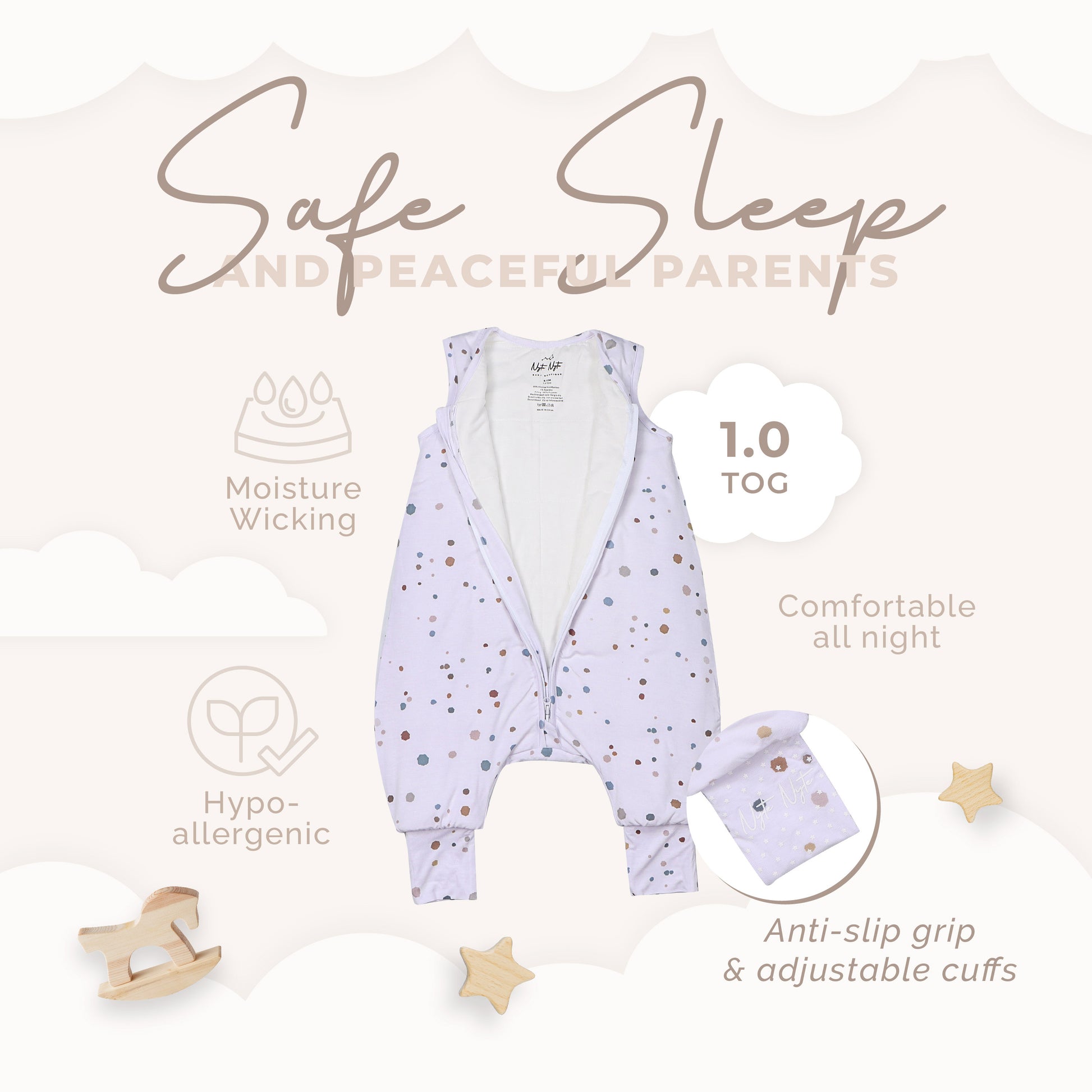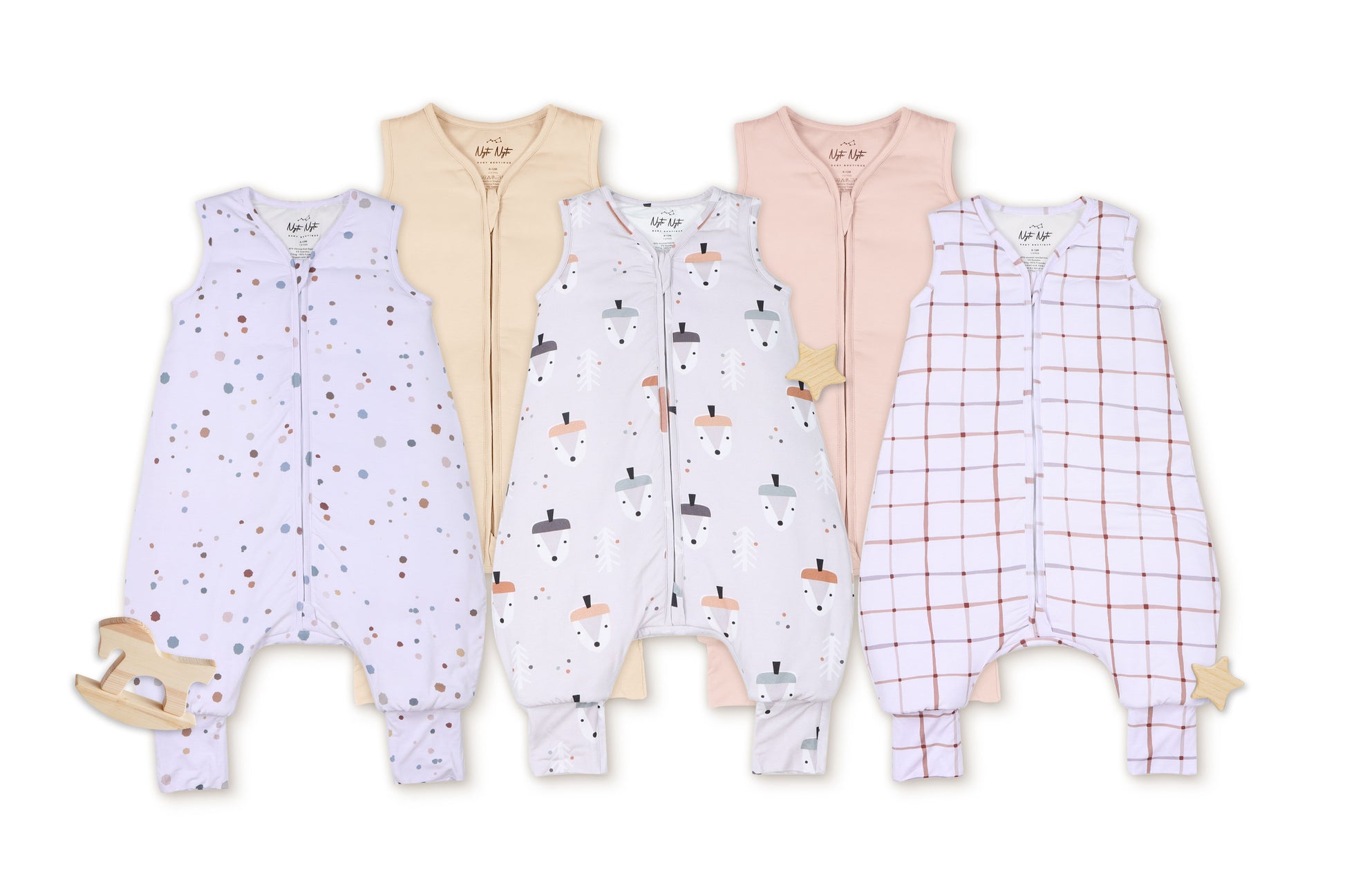 Our innovative separate leg design allows your baby to sleep comfortably and freely, while our adjustable cuffs let you cover or uncover baby's feet depending on the season or room temperature. Our foot cuffs also have anti-slip grip allowing your baby to wear the Nyte Nyte while crawling and walking around without slipping.