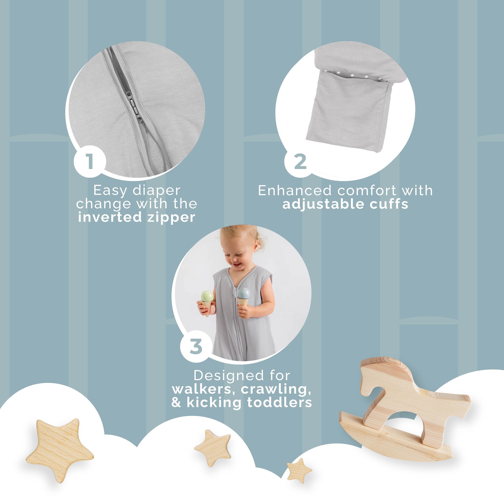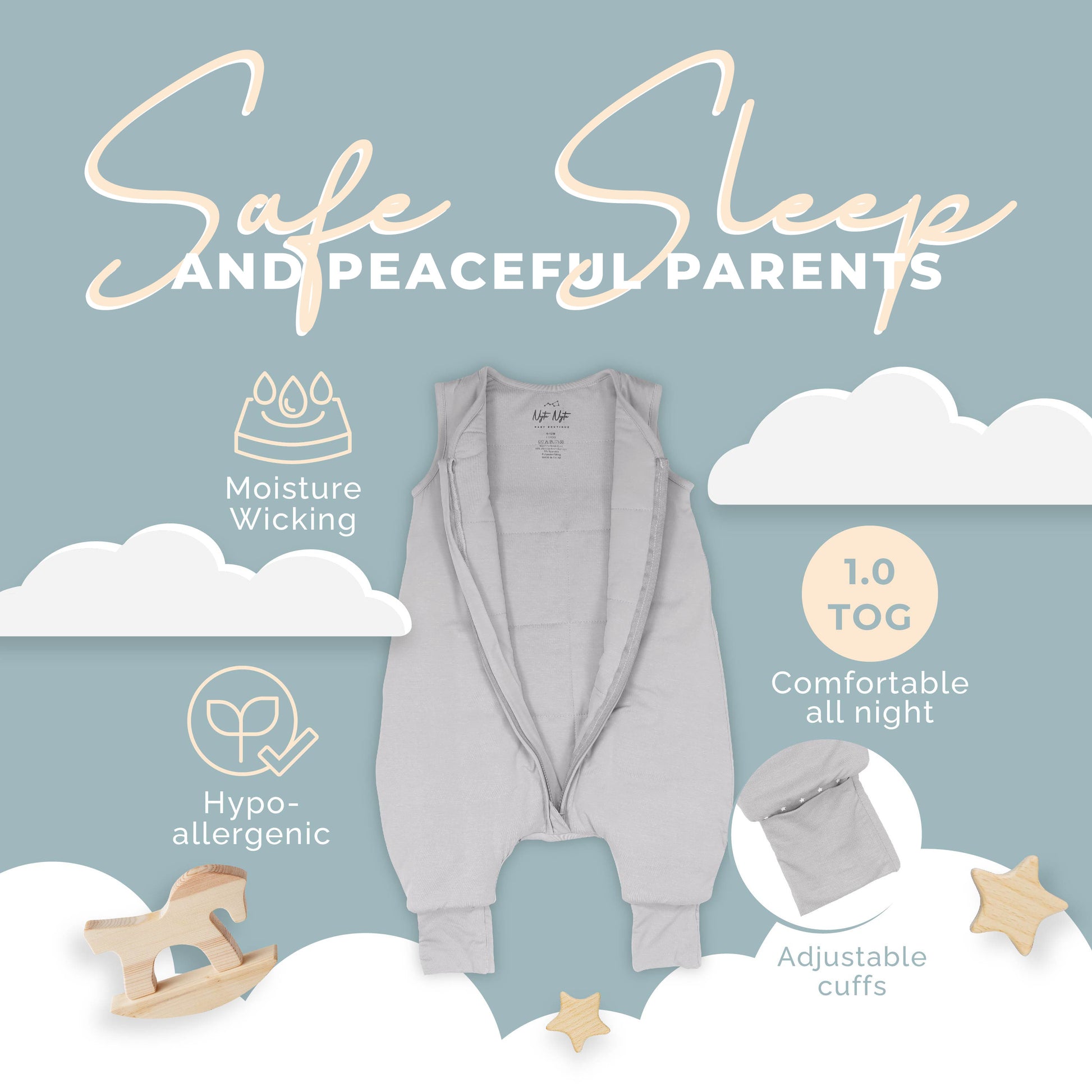 Our innovative separate leg design allows your baby to sleep comfortably and freely, while our adjustable cuffs let you cover or uncover baby's feet depending on the season or room temperature. Our foot cuffs also have anti-slip grip allowing your baby to wear the Nyte Nyte while crawling and walking around without slipping.