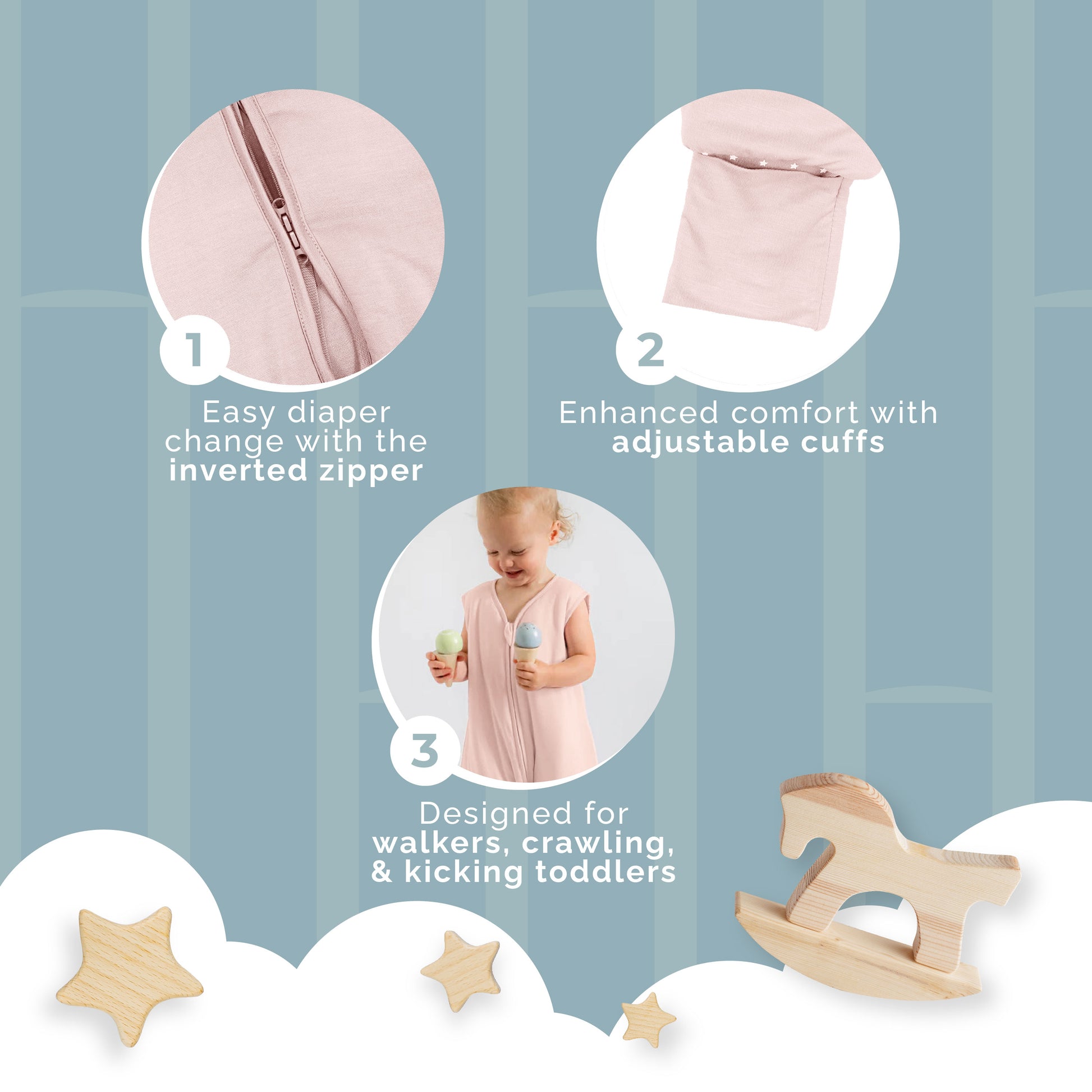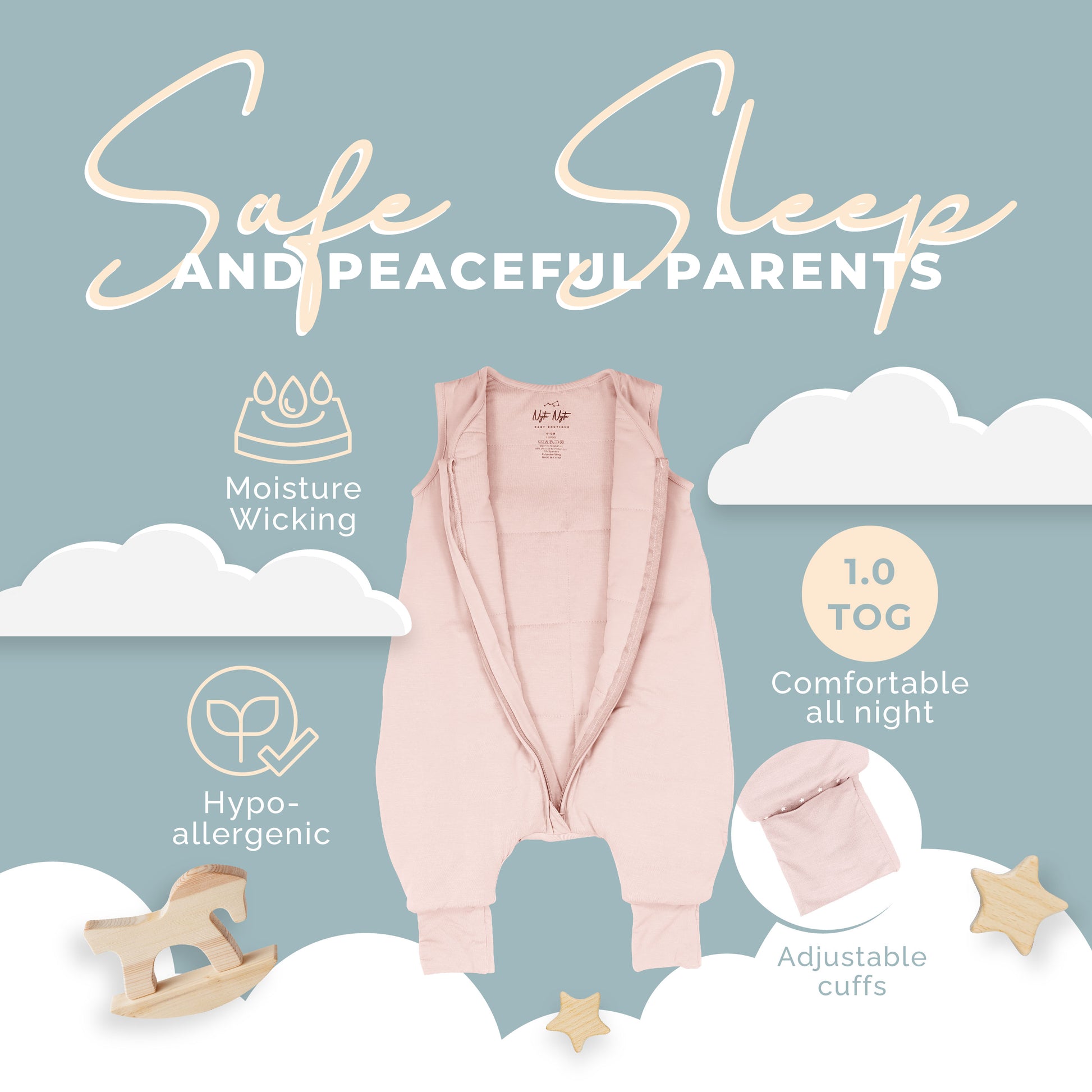 Our innovative separate leg design allows your baby to sleep comfortably and freely, while our adjustable cuffs let you cover or uncover baby's feet depending on the season or room temperature. Our foot cuffs also have anti-slip grip allowing your baby to wear the Nyte Nyte while crawling and walking around without slipping.