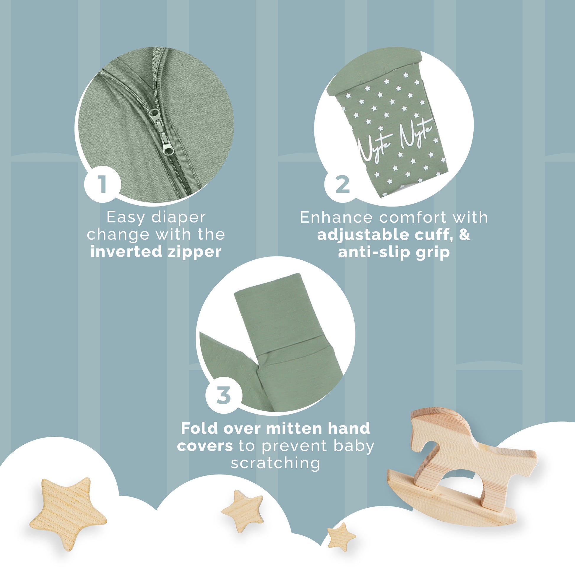 Imagine an inverted zipper for quick and fuss-free changes, adjustable mittens to keep tiny hands warm and prevent scratches during the night, and cuffs with an anti-slip grip for those moments of midnight exploration.