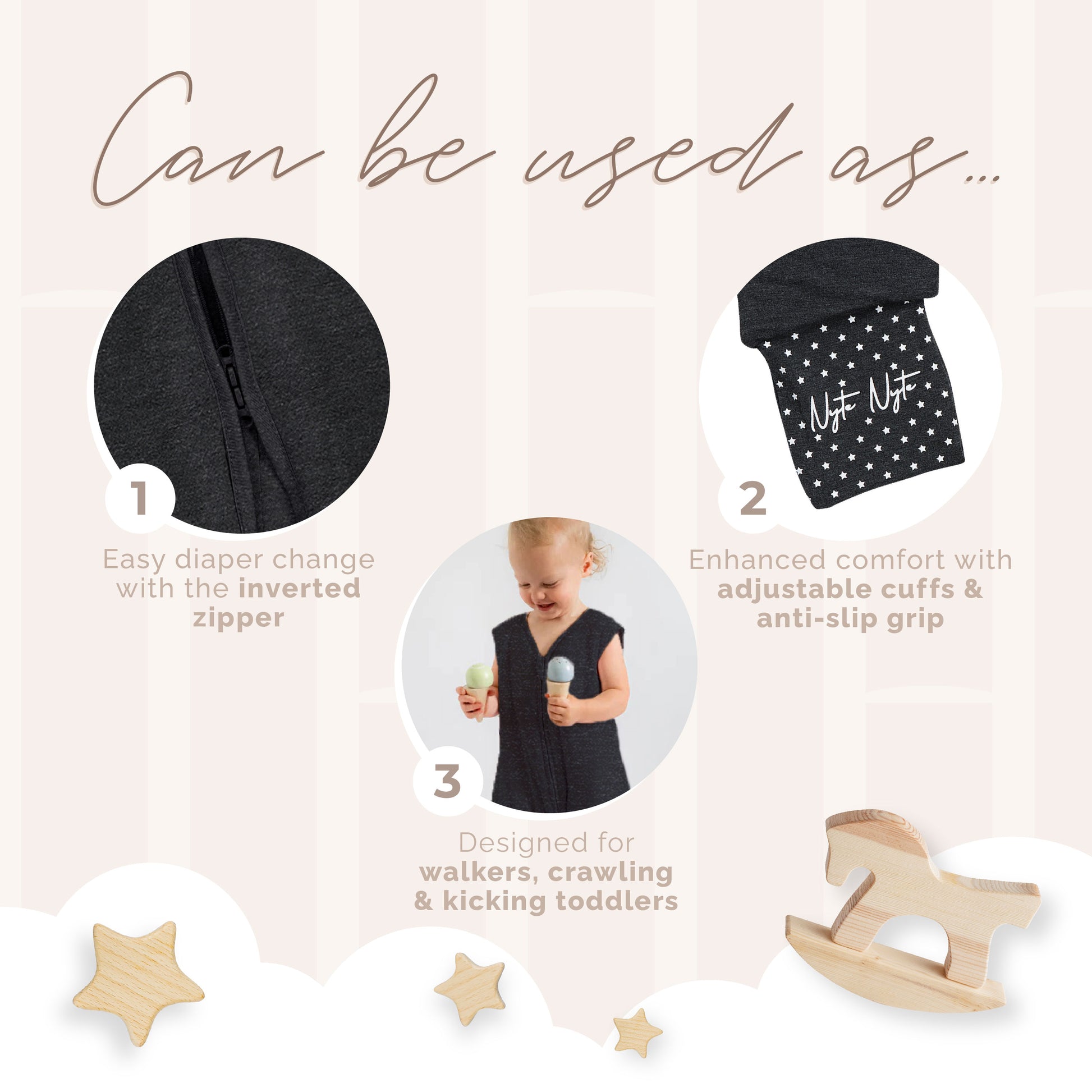 Our innovative separate leg design allows your baby to sleep comfortably and freely, while our adjustable cuffs let you cover or uncover baby's feet depending on the season or room temperature. Our foot cuffs also have anti-slip grip allowing your baby to wear the Nyte Nyte while crawling and walking around without slipping.